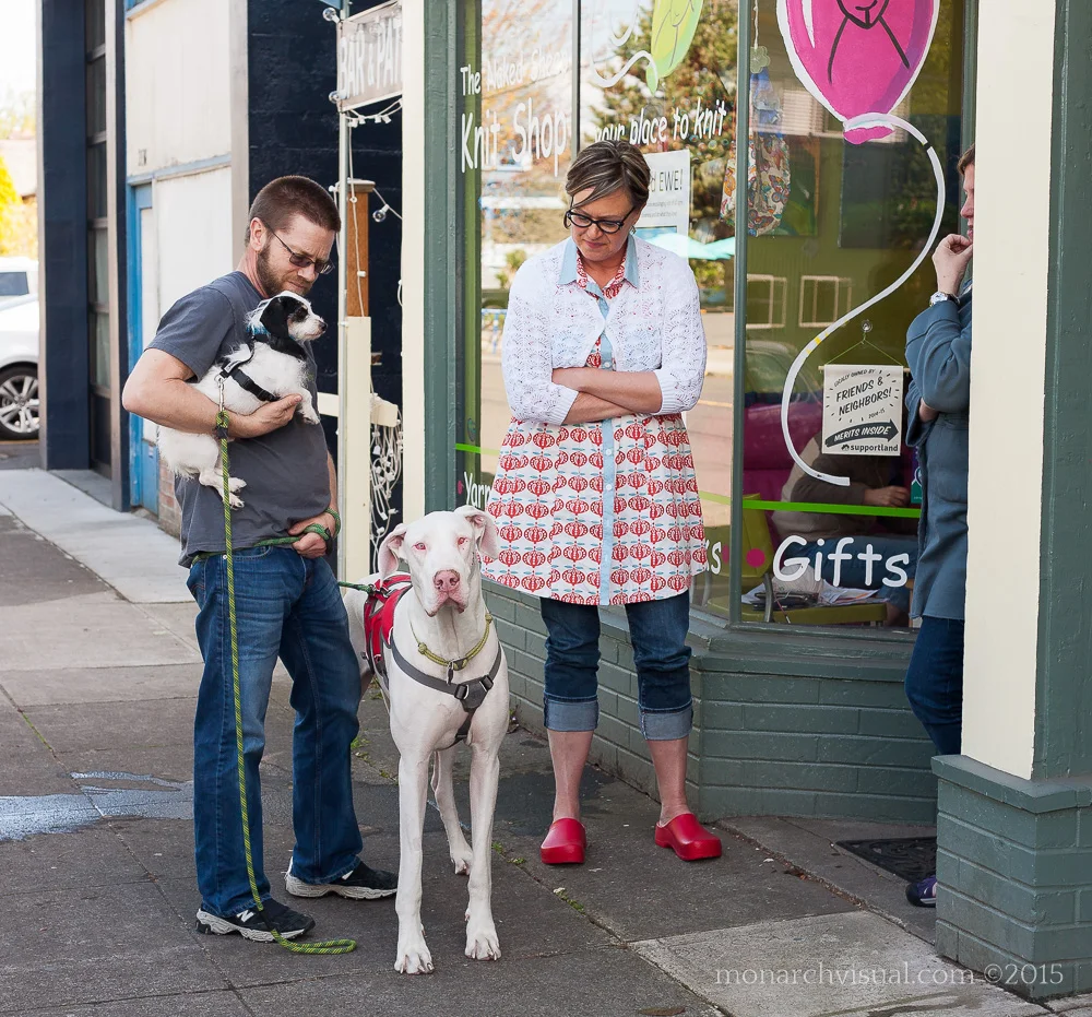 Papa Michael introduces a "Duke" boy to the Naked Sheep knit shop owner